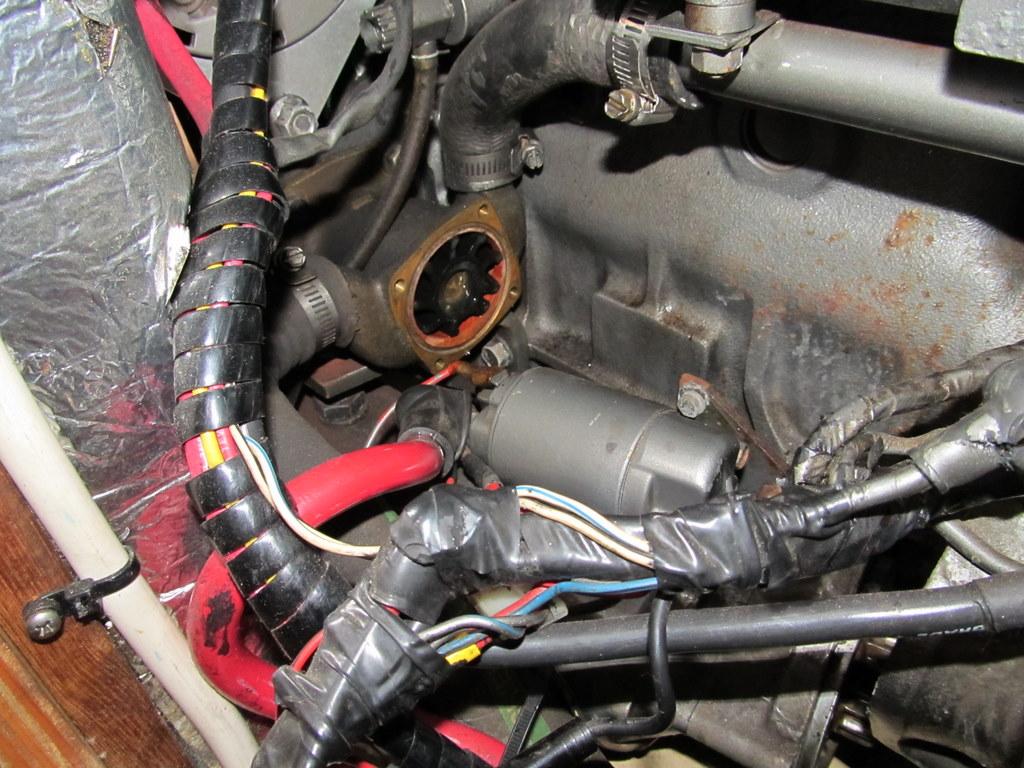 Next task was to replace the sea water impeller. On the 3JH2E Yanmar the starter needs to be dropped in order to get access to the impeller. Due to this….I have not replaced this impeller for 5 years! I thought it was time. So I dropped the starter and used my cool impeller puller to remove the old one and installed a new Yanmar impeller picked up at Haven Harbor. With a slick application of lithium grease, I was able to fit the new impeller into the water pump and get the fins leaning the right way as this pump rotates clockwise when viewed from the stern.
