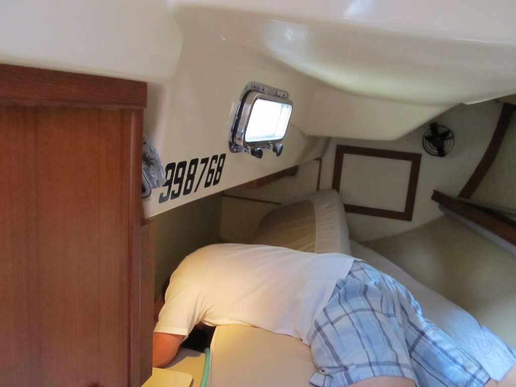 Hayden in the bilge, cleaning! Thanks, Radeen! |