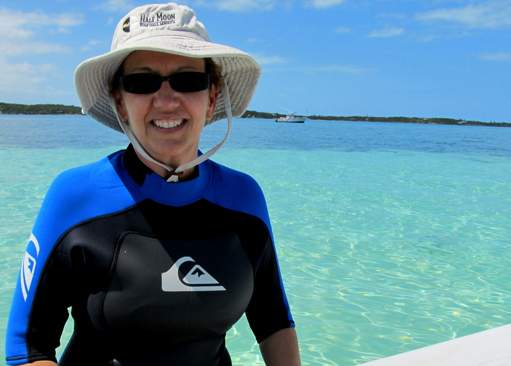 Radeen, happy ocean sailor girl, arrives West End Bahamas by sailboat |