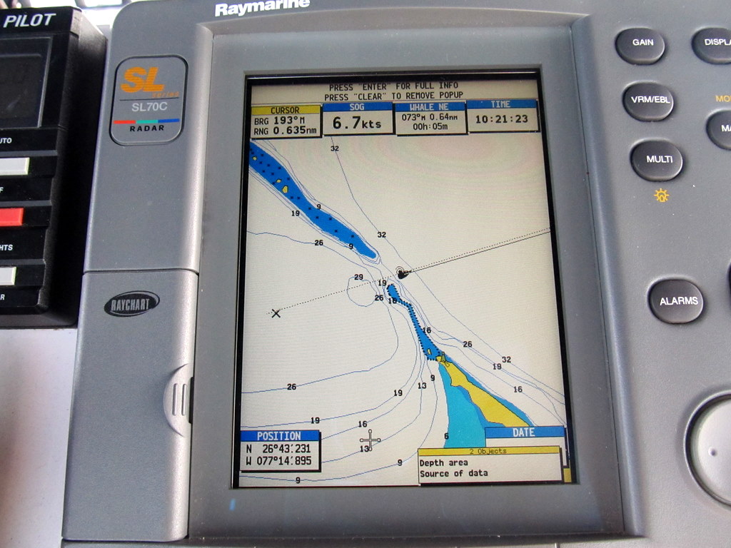 The sun rose over the bow as we sailed East, and we each took turns napping and standing watch as our autopilot and wind vane steering drove us at speeds of 5 knots plus a current of 2.5 knots for a ground speed or SOG of 7.5+ nearly all the way. By 9am the winds backed and we were beam reaching for a wonderful sail in 2-3 foot seas. This backing winds also brought less wind and by 11 am we needed to motor sail since it was less than 10 knots of wind. 8-10 knots would be great in the bay or calm waters, but out in the ocean you need 15+ to really sail through the ocean swells. Usually there is too much wind in the ocean, so this 8-10 was the predicted light wind, which is why we crossed today to avoid high waves in the Stream.
