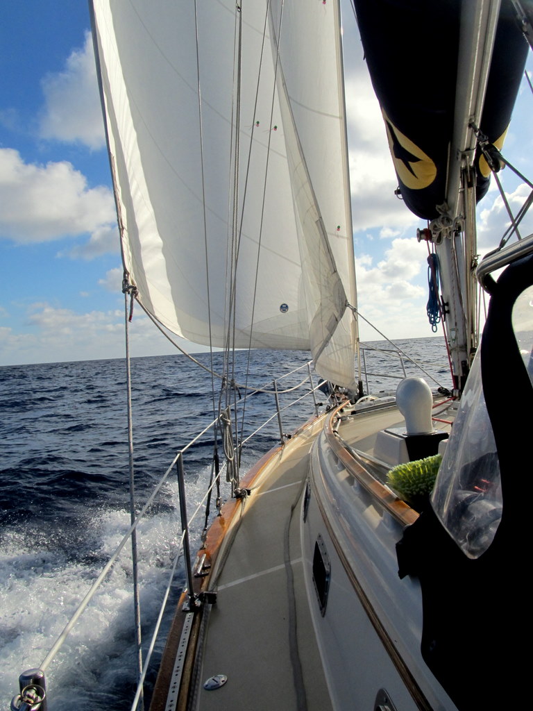 The sailing was close hauled, 55 degrees off the starboard bow because we needed to set a course of 70 degrees for a destination bearing 55 degrees due to the set and drift effect of the 3 knot north flowing Gulf Stream, called the Florida Current.