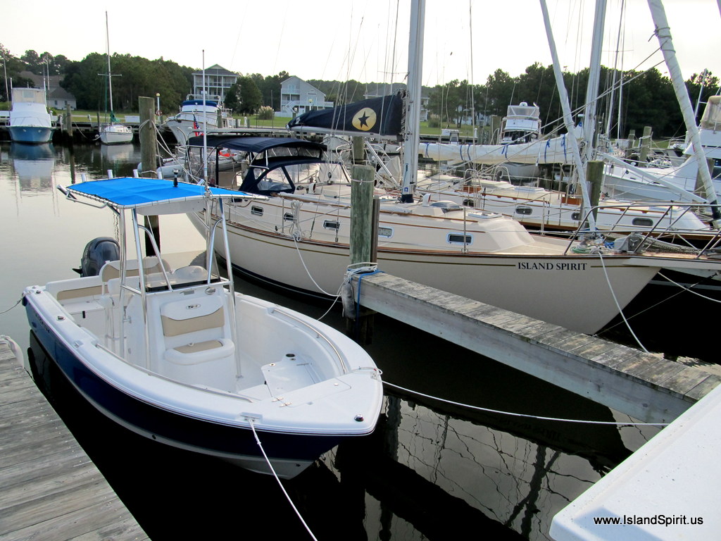 | Island Spirit in dock, mainsail lashed, double dock lines |
