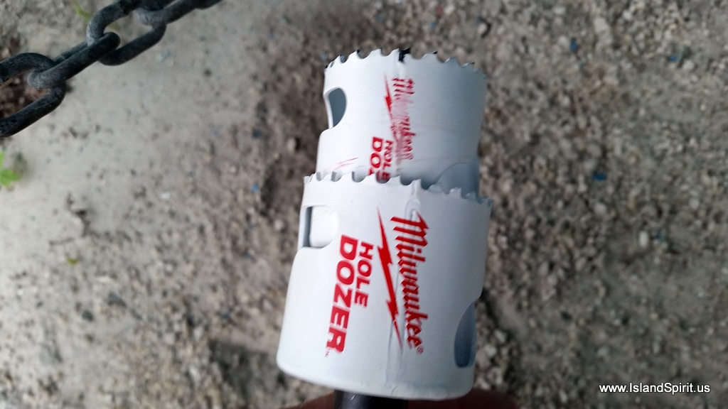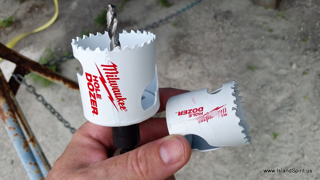 Today, Oct 29, 2016, our third day at the boat, we are working on the hard at  the Hinckley Stuart, FL yard. Unknown to us, we needed to replace a B&G thru hull because the new Triton2 sensors need a larger thru hull. Lucky for us, this turned out not be a big deal. Colin advised me on how to easily run a 1.75″ hole saw inside of a 2″ hole saw and simply drill it out. Drilling took all of about 5 minutes! Amazing. So now with that job completed we could focus on removing all our electronics.
