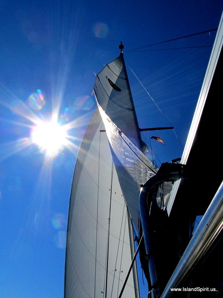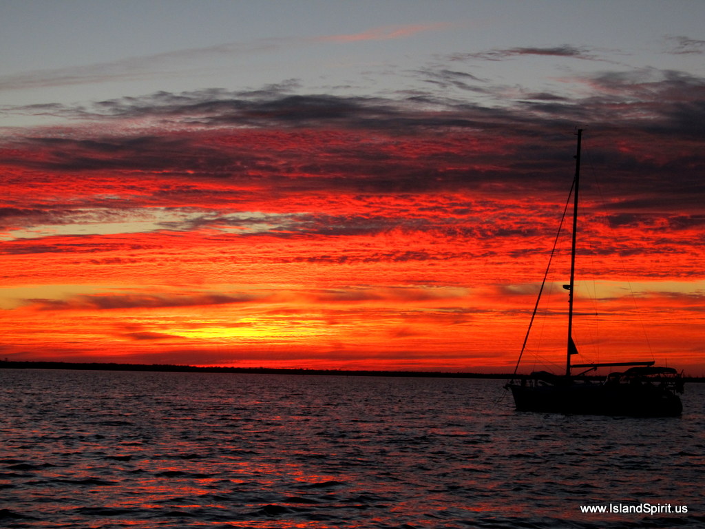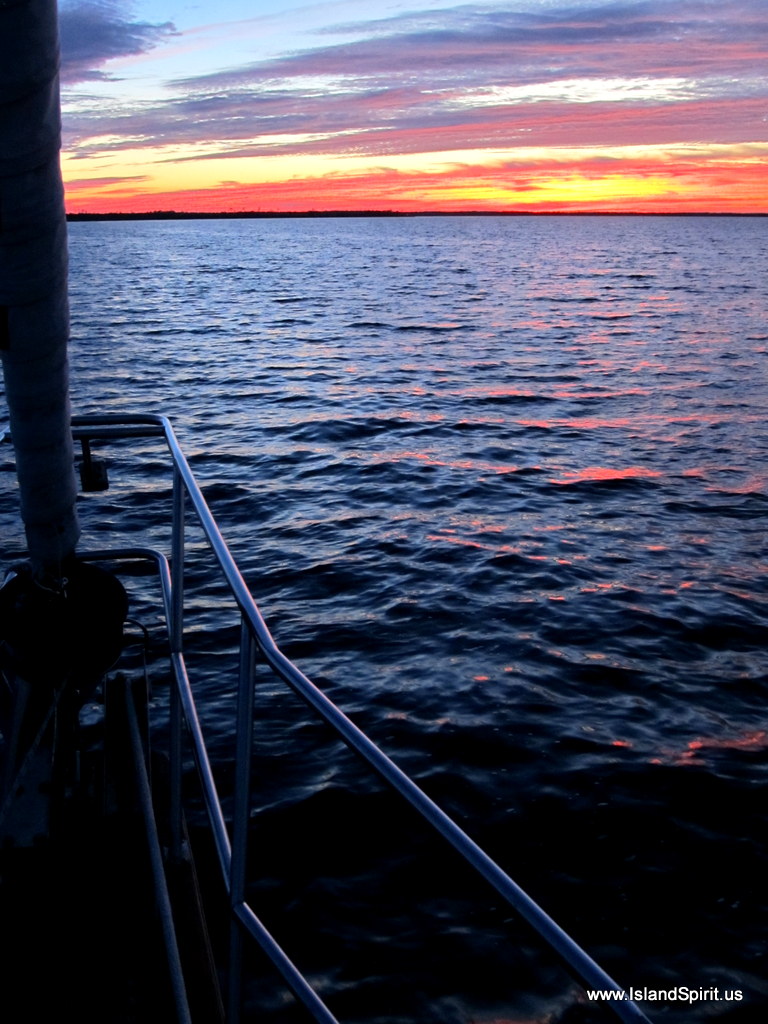 The 42 mile sailing day ended when we dropped anchor with Island Packet Buddies, 350 Kismet and 38 It’s About Time at Deep Point. The fresh west breeze was pleasant and the sunset was spectacular. Sally called it right by saying this was a BLESSING to behold. Fortunate we are to be out here cruising…