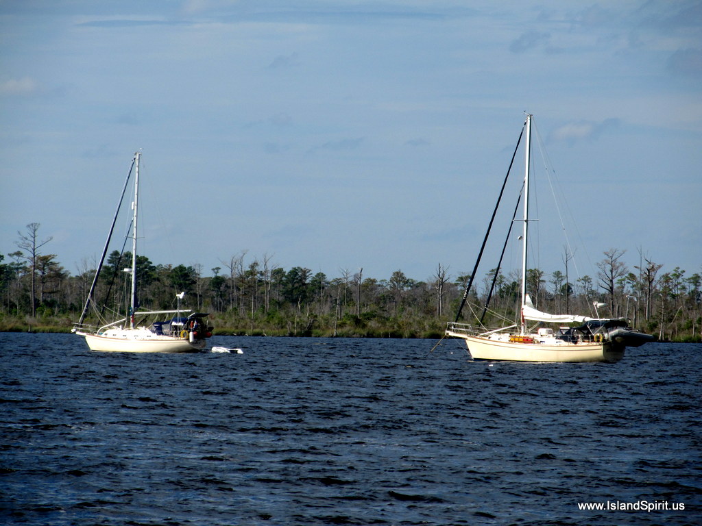 Crossing Albemarle Sound is one of those passages you hear so many dreaded sailing stories about and sailors worry deeply about making this 15 mile crossing! This concern is valid, due to the shallow depths and long fetch upwind. If the wind is blowing, then the Sound will have short steep waves and your two plus hour crossing can be nasty. Lucky for us, the winds were calm, 10-15 knots, and from the west. With a course of 180, south, and a west wind, we had a beam reach right across the Sound and into the Alligator River. What a fantastic sailing day! Under sail, Radeen decided to make a gourmet hot lunch of Mediterranean Chicken with black olives and capers. What a treat, and served in one bowl, it was easy to eat. Radeen is very good at cooking onboard and making great meals. Check out her site at http://BoatRecipes.com and share your best boating recipes.