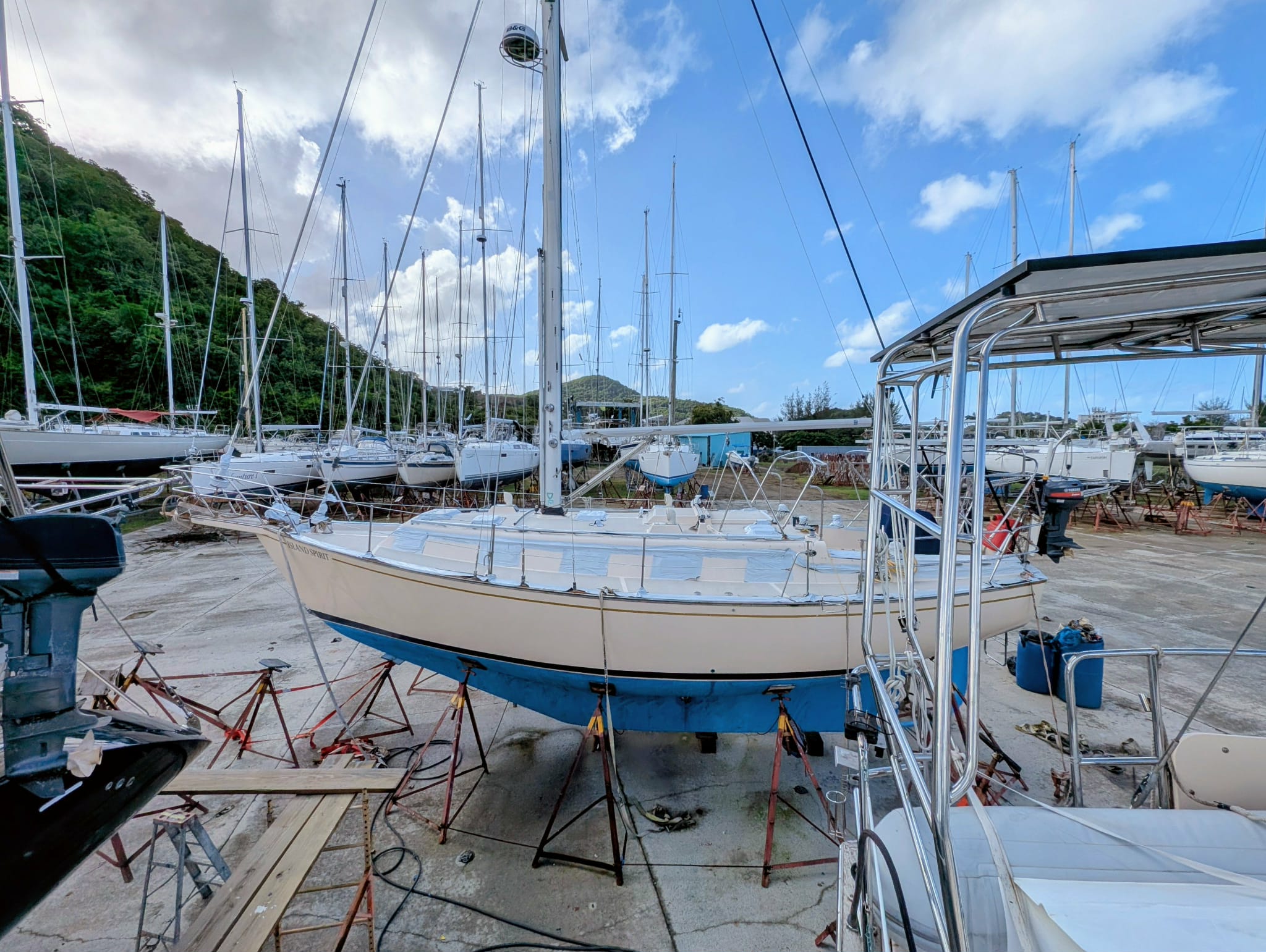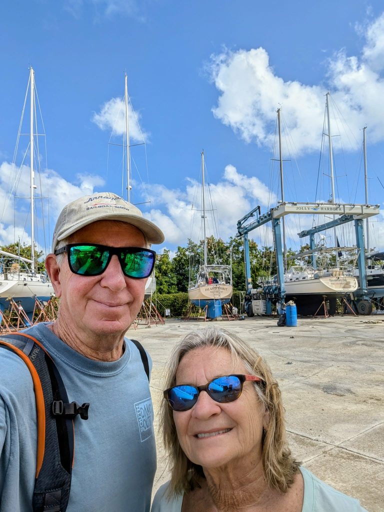 Island Spirit is safe in the #1 boatyard, Jolly Harbor Marina, where we will return Jan 4, 2026! Our dear friends, Steve and Maria, on the mothership IP485 SAVANNAH SKY https://savannah-sky.com/ sent us these great photos of our boat.