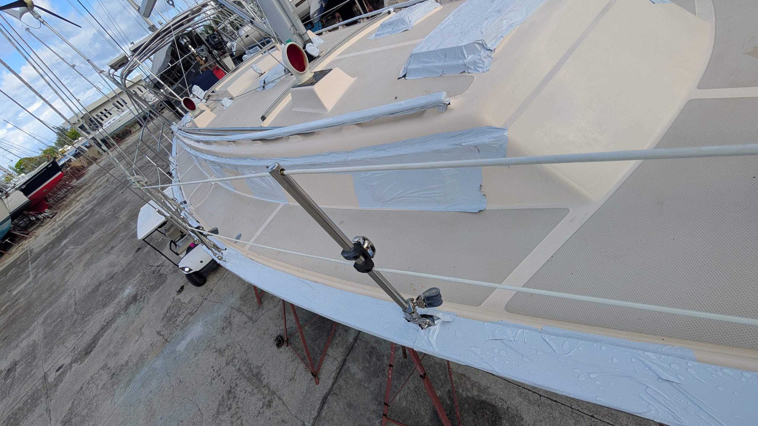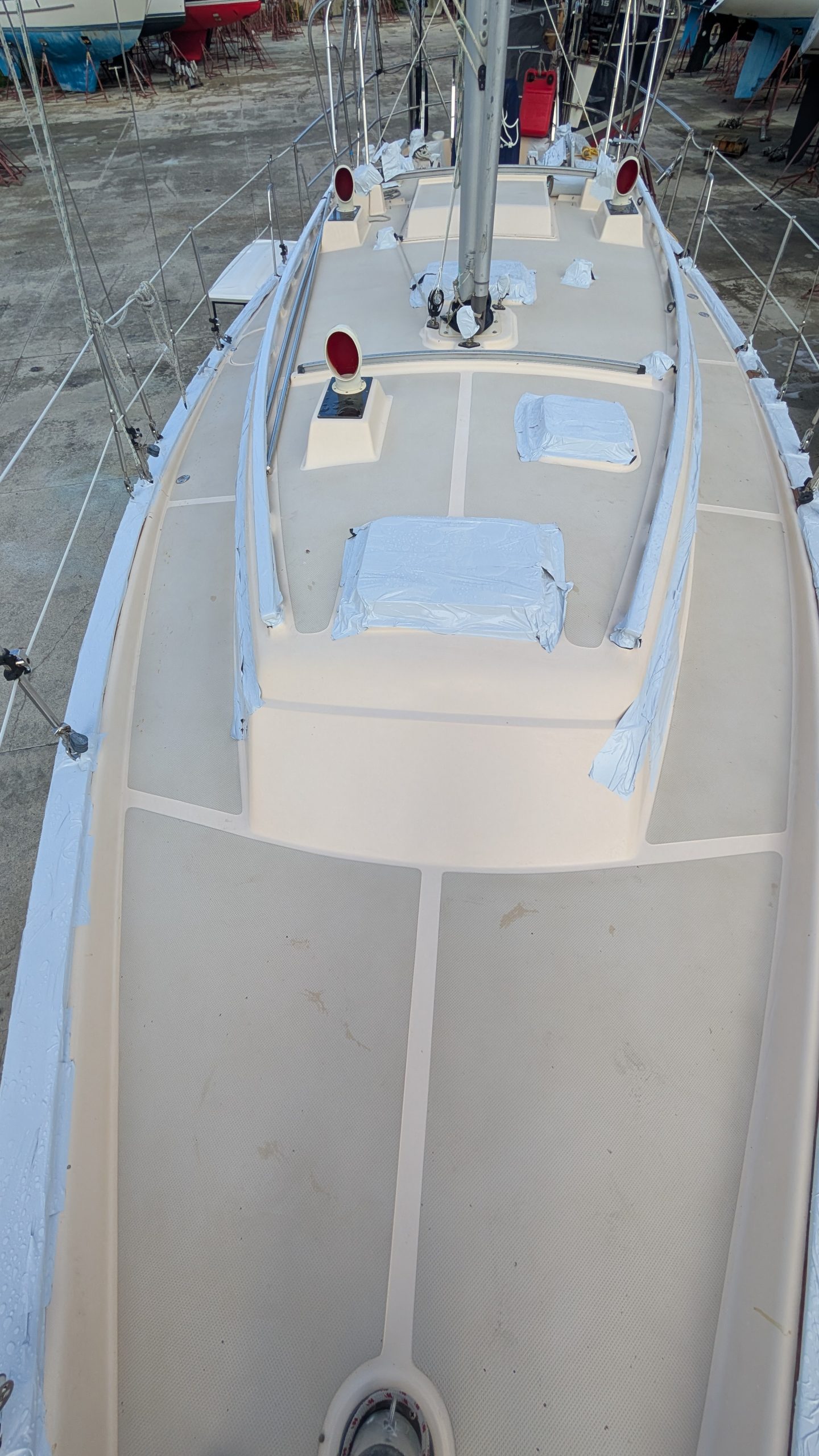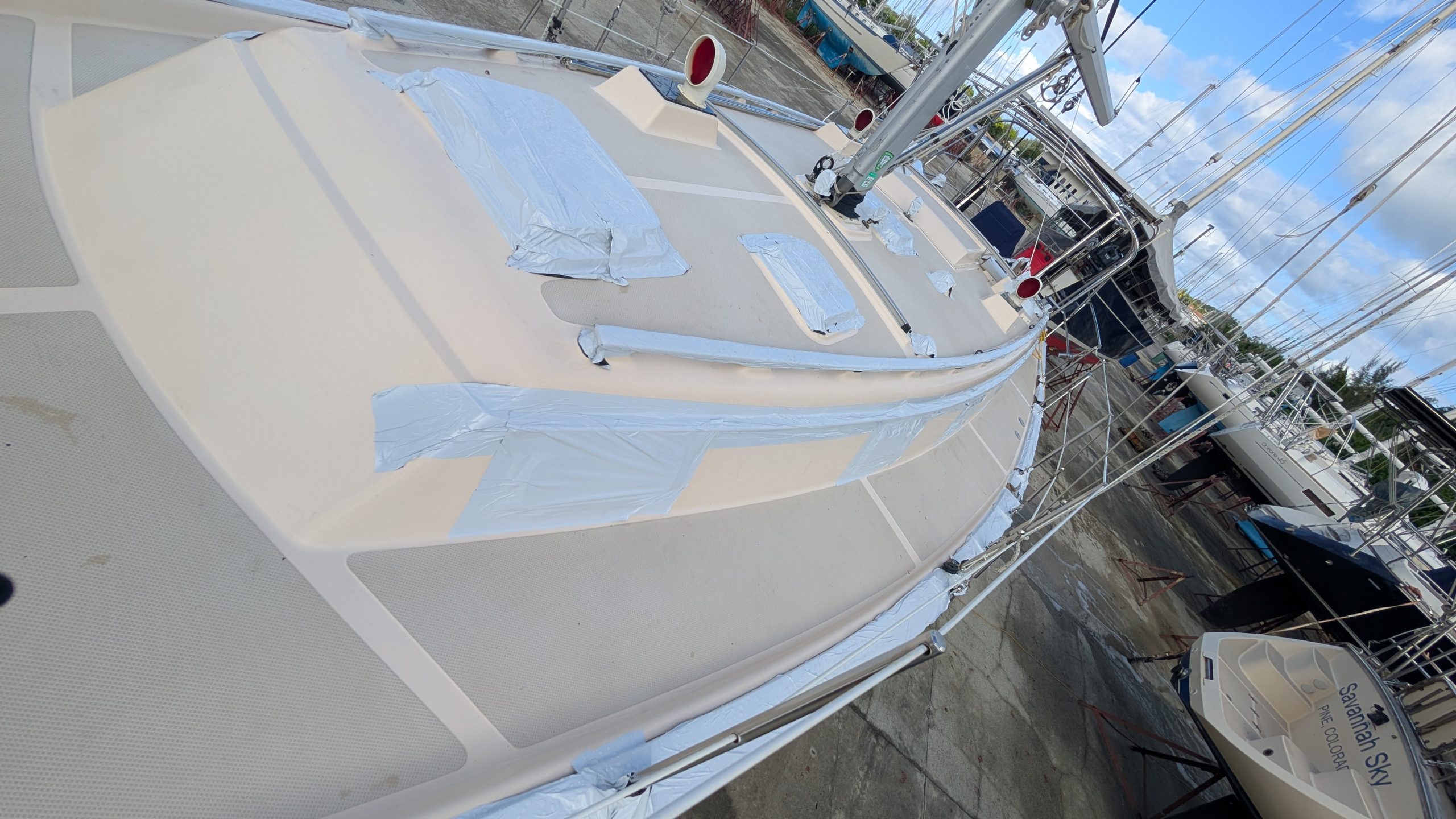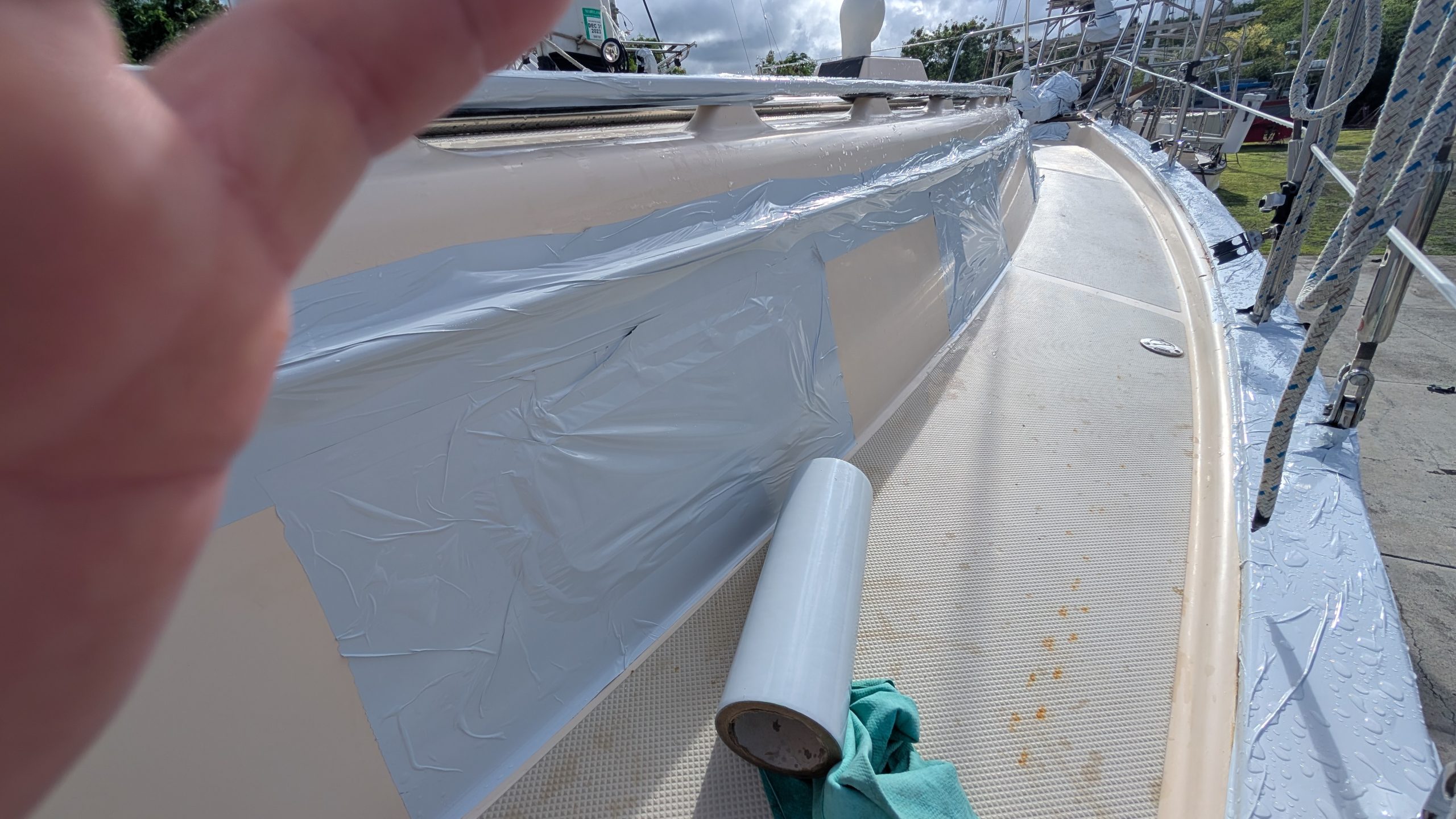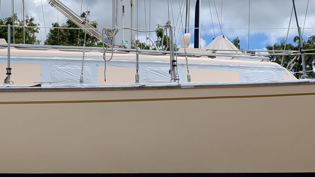 We have been using this protective white tape for well over 5 years. I have posted many photos of this and how well it works. I was introduced to it in Grenada when a mega yacht 150 footer was taping their varnish with it. I WAS SHOCKED. I asked why and what it was. They were prepping to cross the Atlantic and said they put this on when going to sea on passages as it protects the vanish. Of course my next question was….does it pull off cleanly? They said yes. That yacht team told me about NATIONAL MARINE company. They service the mega yacht industry, and if you see your yacht here, I will be impressed: https://nationalmarine.com/