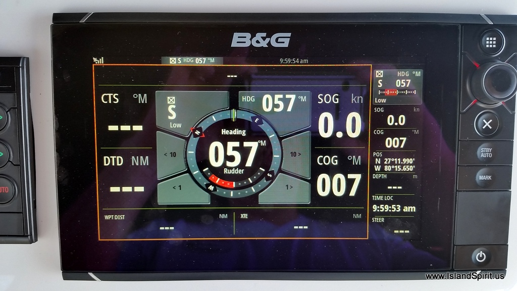 So, what actually went wrong? This gear was just released on Oct 27. It is so new, in fact, the B&G staff does not have an NAC-3 pilot installed at the tech support center, so we are on our own out here testing, documenting and learning along with the consistently polite and helpful B&G staff. It is exciting, but also makes it even more challenging and we need to try to solve our own problems. In doing so, we jump back in and look at our installs, we get out the 50+ page installation manuals and re-read them for a ninety-ninth time. Yes, there are errors because they are new, version 1.0. Then we call tech support and they tell us that they are not sure, but go check all your connections and wires. While doing this in the sail locker, we discovered that the NMEA 2000 drop cable from the NAC-3 autopilot was pulled out of the circuit board. WHAT? How could this happen? Well it happened because B&G has no wire clamp or other fitting to keep the plug in the circuit board. So, if you happen to pull on this wire, it unplugs from inside the box (while still looking fine on the outside) Then the NAC-3 pilot is offline and cannot be found on the network. There it is, simply a wiring issue. It took a several phone calls and installing new updated software and rebooting until we found this easy wiring issue. Once it was solved, the gear configured itself and found the autopilot computer. Perfect!