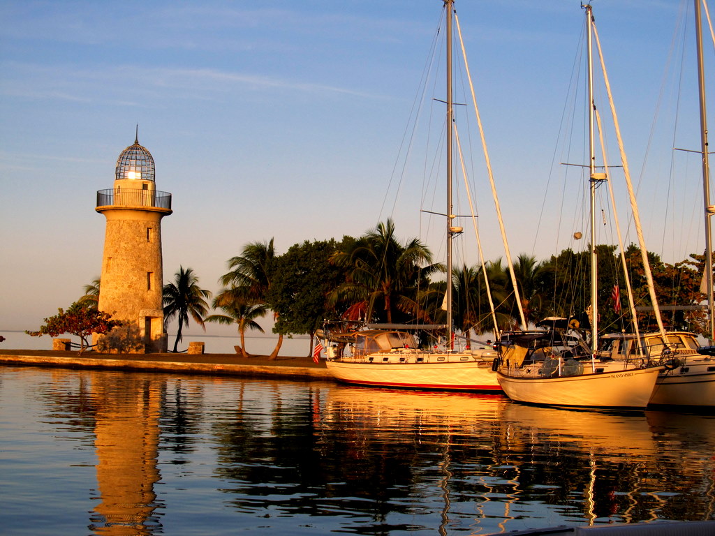 | Sunset over Biscayne Bay with lighthouse cove base and palm trees |