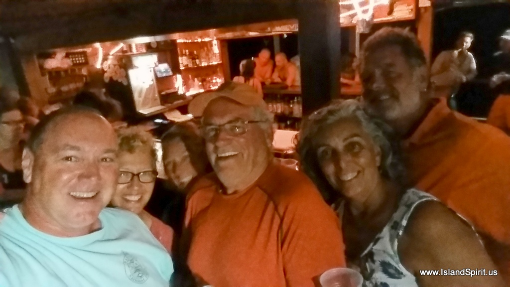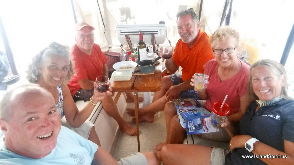 We are really enjoying our boat buddies, Lauren and Bill on 42′ Grand Banks SEA STAR and Meloney and Don on 380 Lagoon FEZYWIG. We are an unusual bunch and we think there is a funny story to tell that would start out….A Motor Yacht, a Catamaran and a Monohull pull into a harbor and ... but that is as far as we have gotten. We are all very lucky to have buddies to run around with and to share the discoverr and the adventures together. We will all store our boats in Puerto Rico and actually be on the same flight out of SJU to PHL. Sea Star is heading to Canada via Buffalo NY and Fezywig is heading to Toronto for the summer. We are heading to PHL. Here is a fun gathering on Island Spirit off Norman’s Island.