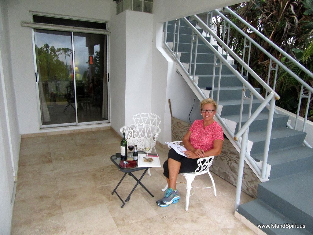 | Our private patio for wine and cheese. There is a lovely breeze here every evening. At night, we are lulled to sleep by the tree frogs peeping. Such a lovely spot! |