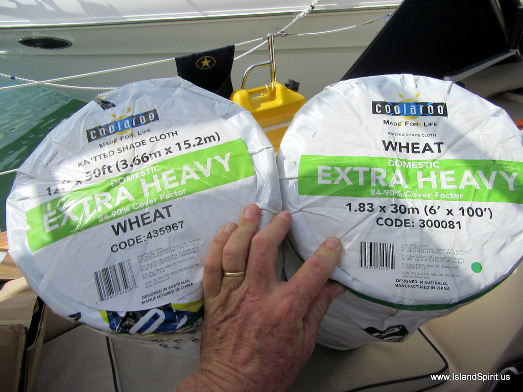 Time to finish the de-rigging and prepare for haul out. Then Monday and Tuesday it will be Coolaroo Shade Cover Round #2. We will cover the entire boat like we did last year with a 90% UV breathable sun cover fabric. This is what it will look like when we have the cover on….