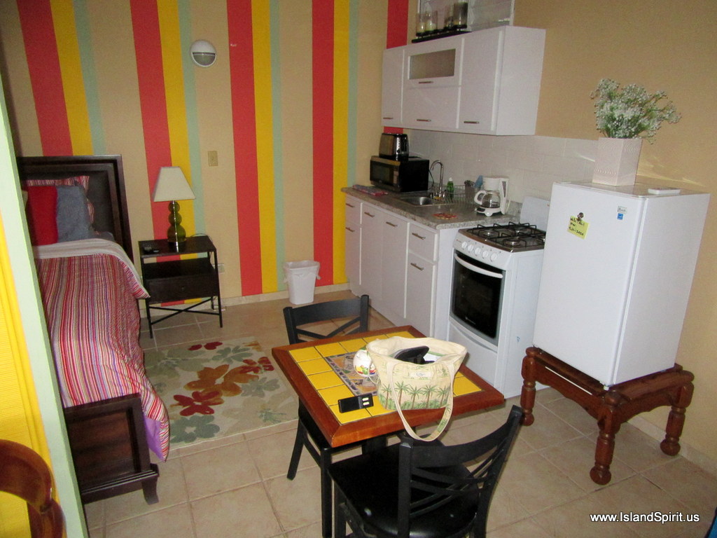 | Our kitchen and dining table, gas stove and small refrigerator. |