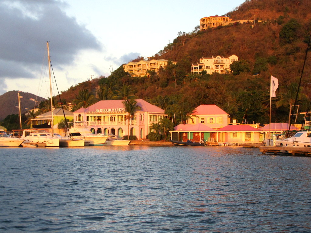 | The sun sets on Soper’s Hole’s colorful buildings |