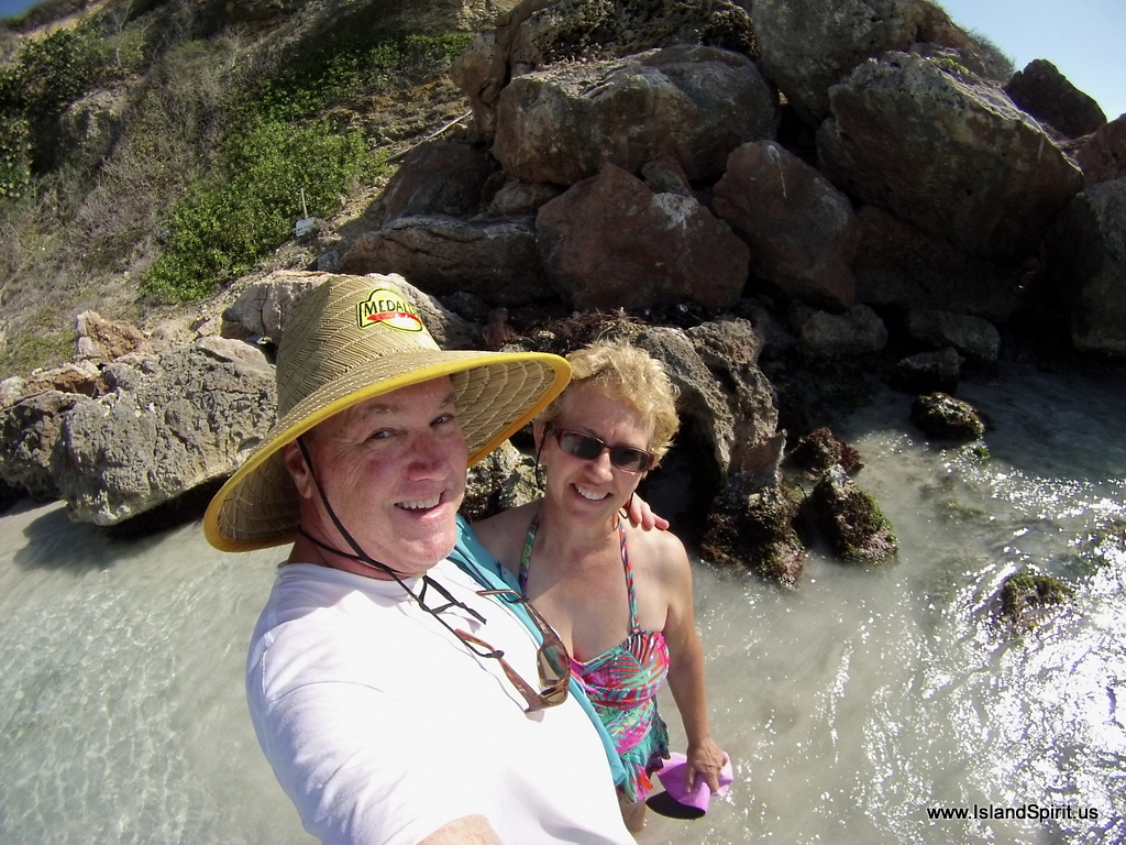 With our mission completed of acquiring boat permits from the National Trust of the British Virgin Islands, over in Road Town, it was now time to move into the BVIs and snorkel. After a very very rolling night and very little sleep off Sandy Spit due to the North Swell wrapping around and rocking our boat from gunwale to gunwale, we headed east for Guana Island and Monkey Point. Our $150 permit allows us to use the many mooring balls placed through out the BVIs at all the key snorkeling and diving locations. You are allowed to take a RED mooring ball and secure your yacht to this for 90 minutes while you jump in the water and check out the beautiful fish and coral reefs. Our first mooring we used was at Monkey Point and our stern was only about one boat length off the rock with the waves breaking on the rocks. The swell was rolling us back and forth here as well and we were at first concerned about being so close to the rocks. But we lowered the dinghy, our diving platform and we jumped into the water. What a great feeling snorkeling right off your boat onto a beautiful coral reef in crystal clear water, and it is only 10 am in the morning. Sooooooo many reefs and so little time. Radeen and I love to snorkel. Check out these GoPro photos…