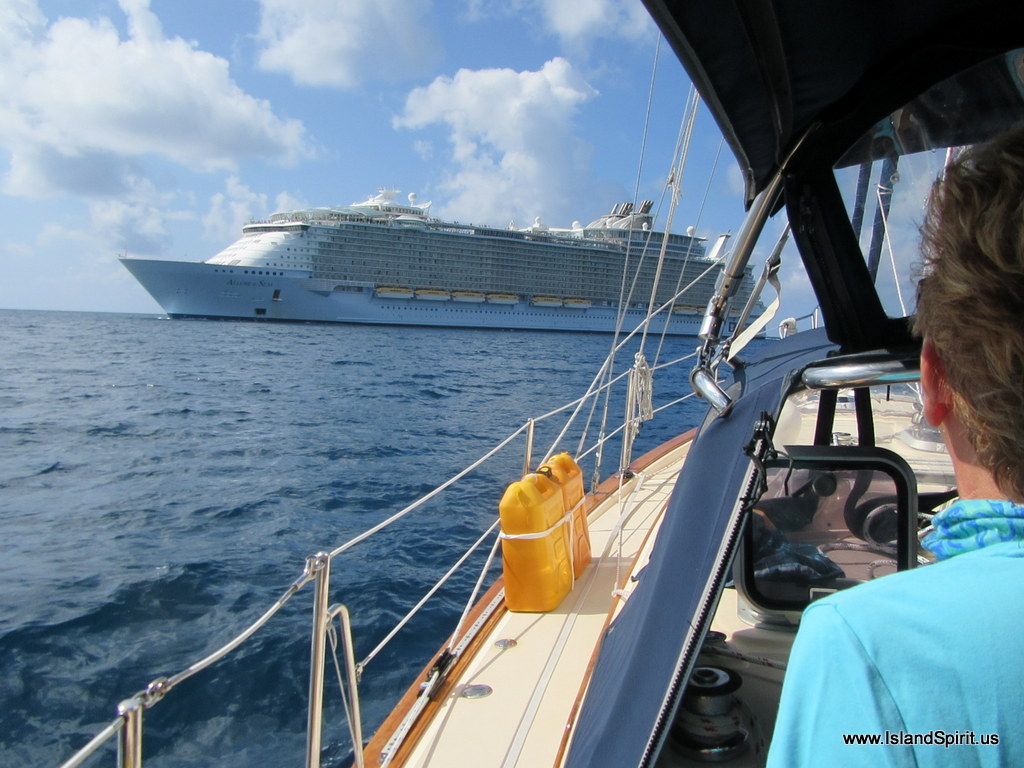 One of the most interesting things that happened was when we left St. Thomas and headed out to the BVIs, we were passed by an incoming cruise ship. We actually had to divert and then take his stern as he was going 12 knots and we were going 6 knots. We could not cross his bow, so we let him cross us. Good idea, right? The ship was also on starboard, so he had the right of way. We were soooooo close, it was very interesting. We had fun waving to all the poeple standing on their balconies and waving back at us. Here are the photos of the crossing….
