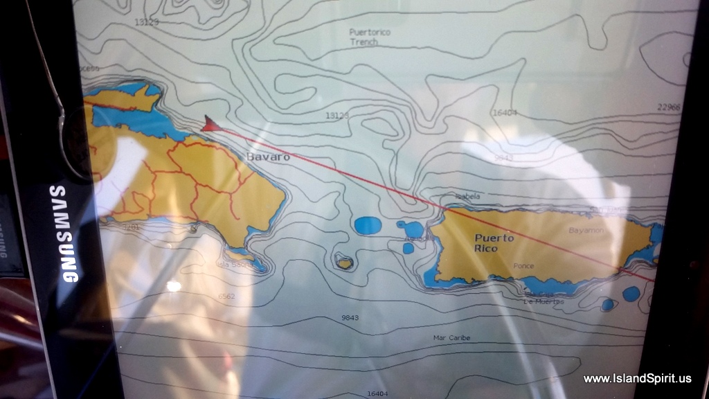 The beginning of the trip was flat calm with main and jib and 2500 rpms motor sailing at 7 knots out of Samana harbor and past the capes. By midnight, we reached our point in the 1,000 to 2,000 meter waters well off the “hourglass shoals” which is known to have confused seas and crazy currents. We found the seas were a bit confused and the current was not too strong. We had a NE swell, and NW wind blown chop, and a S current, all making for a strange sea state. But overall, it was a relatively calm passage. We then turned SE for the Puerto Rican coast, aiming for the SW corner where we could check into Puerto Real harbor.