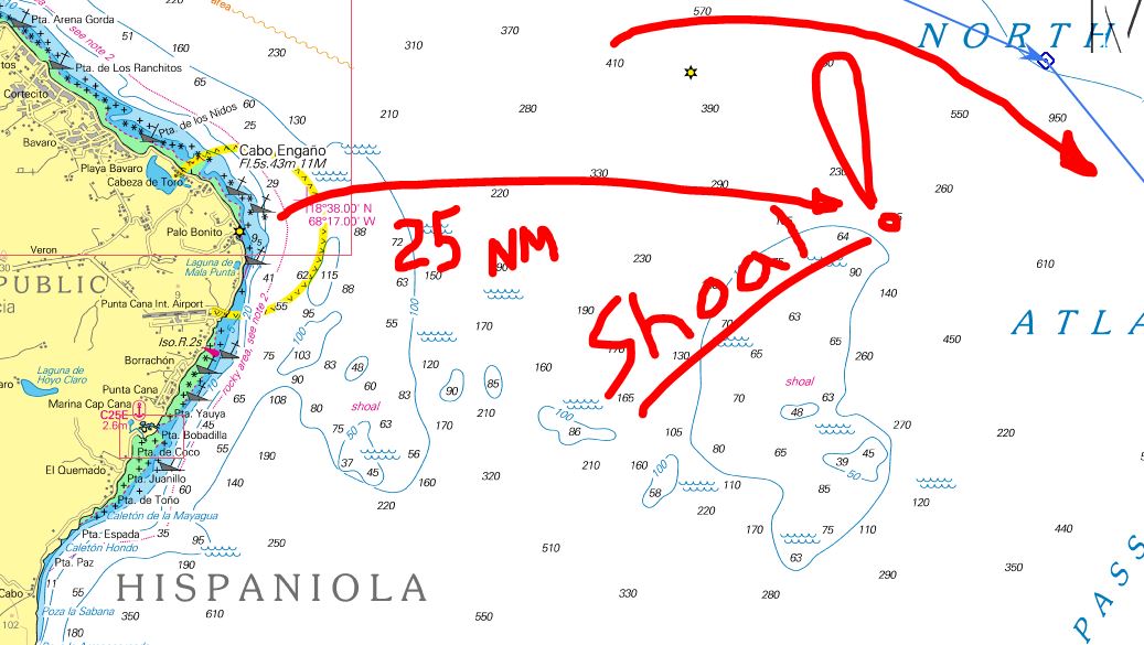 | You have to go out 25 NM off the DR to clear the Hourglass Shoal where waves and currents are bad |