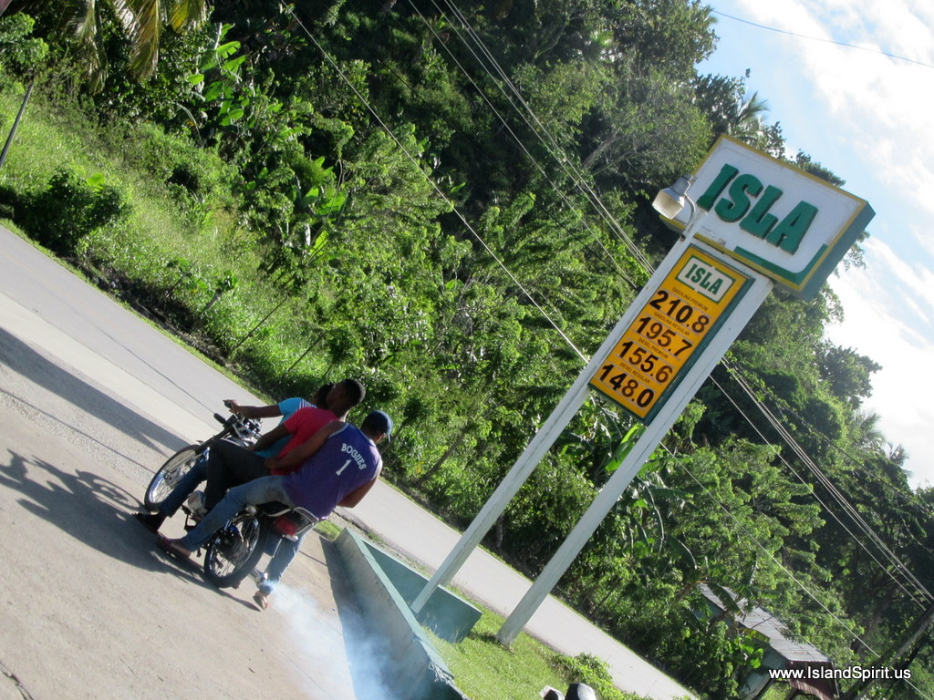 Our first task leaving Samana was filling up the car which arrived on fumes. We stopped at the closet station 10 km away and we filled it up. That cost us $60 US and we ended up leaving about $20 of gas in the car at the end of the day. With wages averaging $10 per day here, this was a real win for the owner of this car. Notice the sign for the gas station prices. RD 210 per liter. The exchange rate is $1 to RD47. That works out to $4.46 per liter. One US gallon is 3.75 liters. So That means this is $4.46 x 3.75 equals $16.75 per US gallon! No wonder everyone is running around on small Honda Z3000 motorcycles. They must get 50-75 miles per gallon.