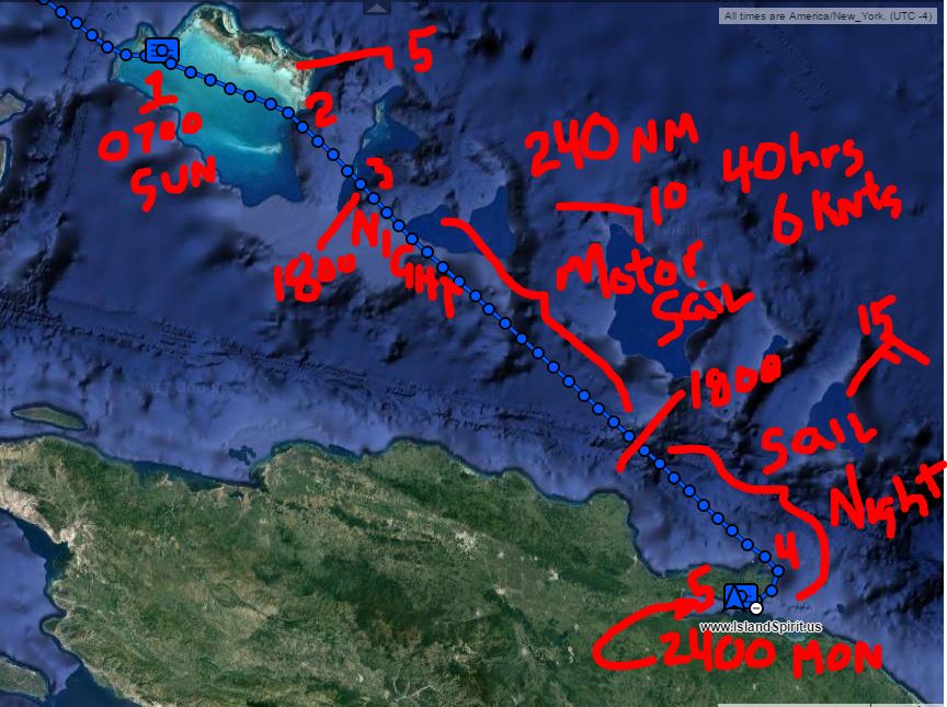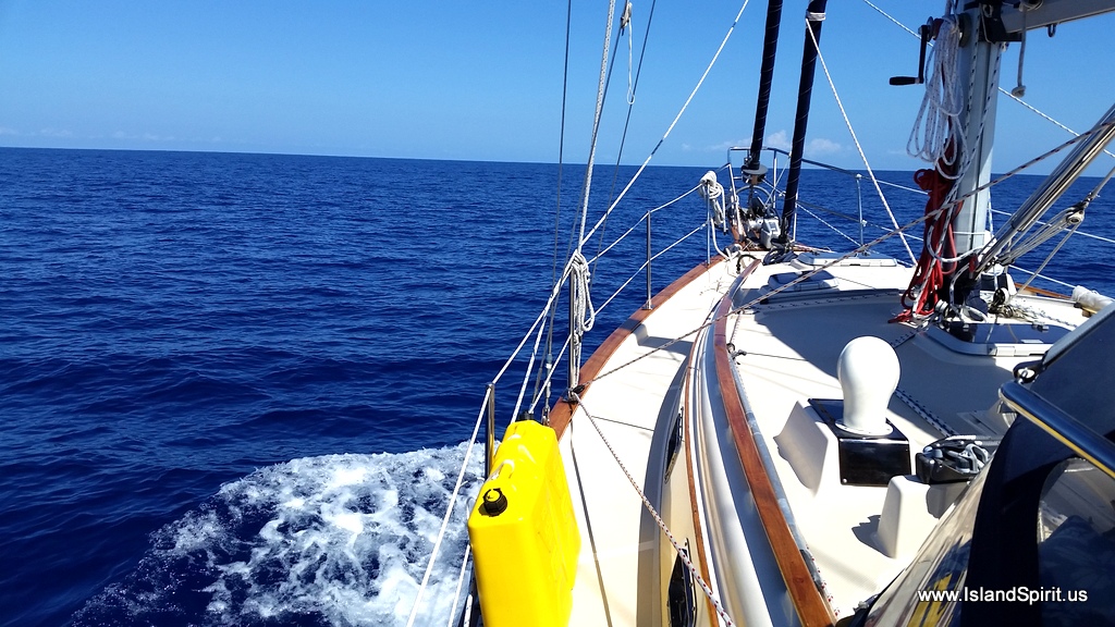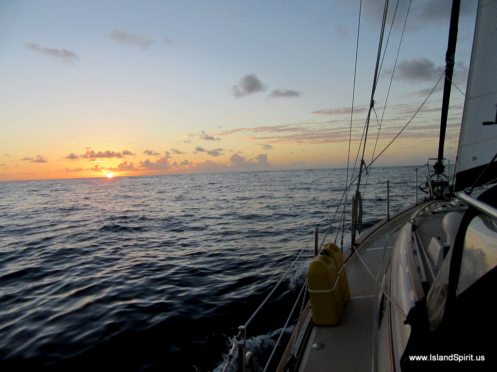 Yes you make 150+ miles a day, but you also have to listen to the engine. The nice aspect is that we took no waves or spray over the bow. The sea had a gentle roll of 2-3 feet maybe 10 seconds and the winds never changed for over a day. Then on day two, as forecasted, the wind shifted in a matter of minutes and built to a solid 10-12 knots. It was at this time we finally killed the engine and sailed about 6 hours into sunset and on into the night until around midnight when we turned towards Samana.