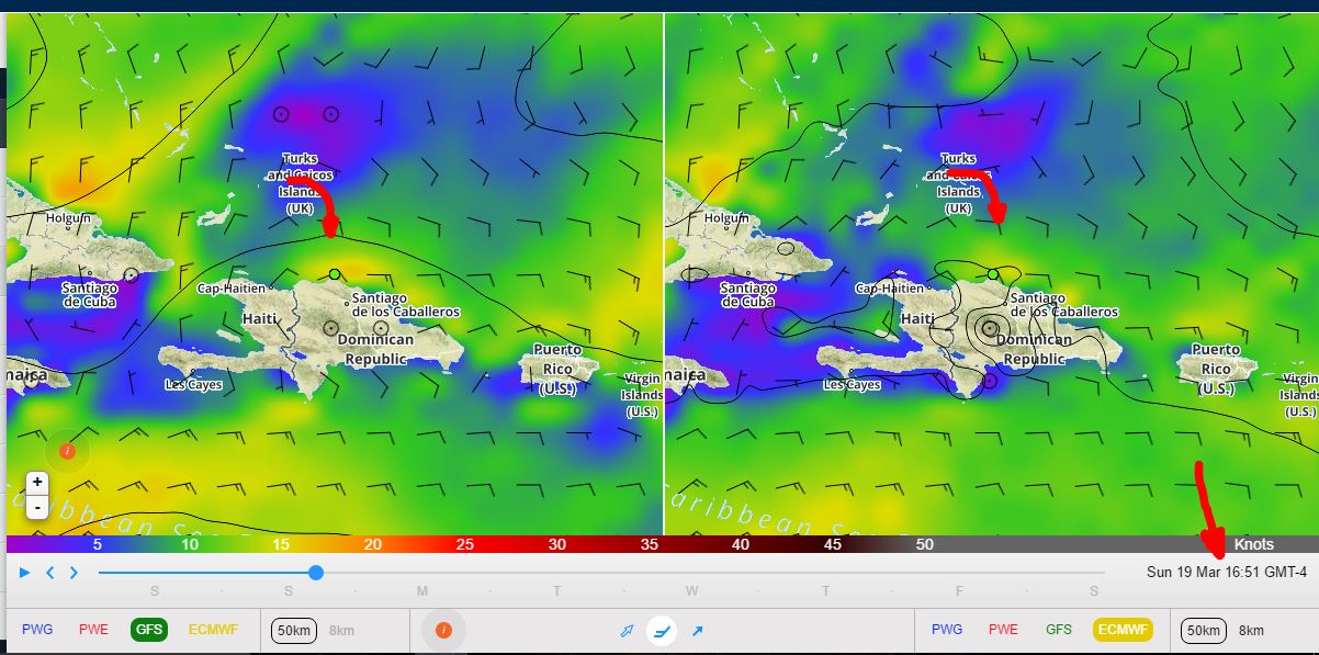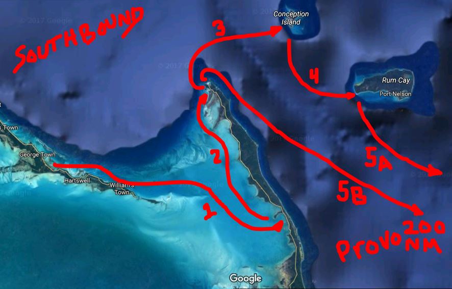 One of the things we learned is that there are shallow banks that you need to pay attention to out here in the middle of the ocean. We are in thousands of feet of water and then there comes a sand bar island….oh….that is Big Sand Key. Well, who put that in our way? Go around that. Then south of that you have the Mouchoir Bank that rises up from 14,000 feet deeo up to 50 feet and yup, it has a ROCK that you can wreck you boat onto. So, find that and divert around that as well. Look at these chart images and you will see these features.