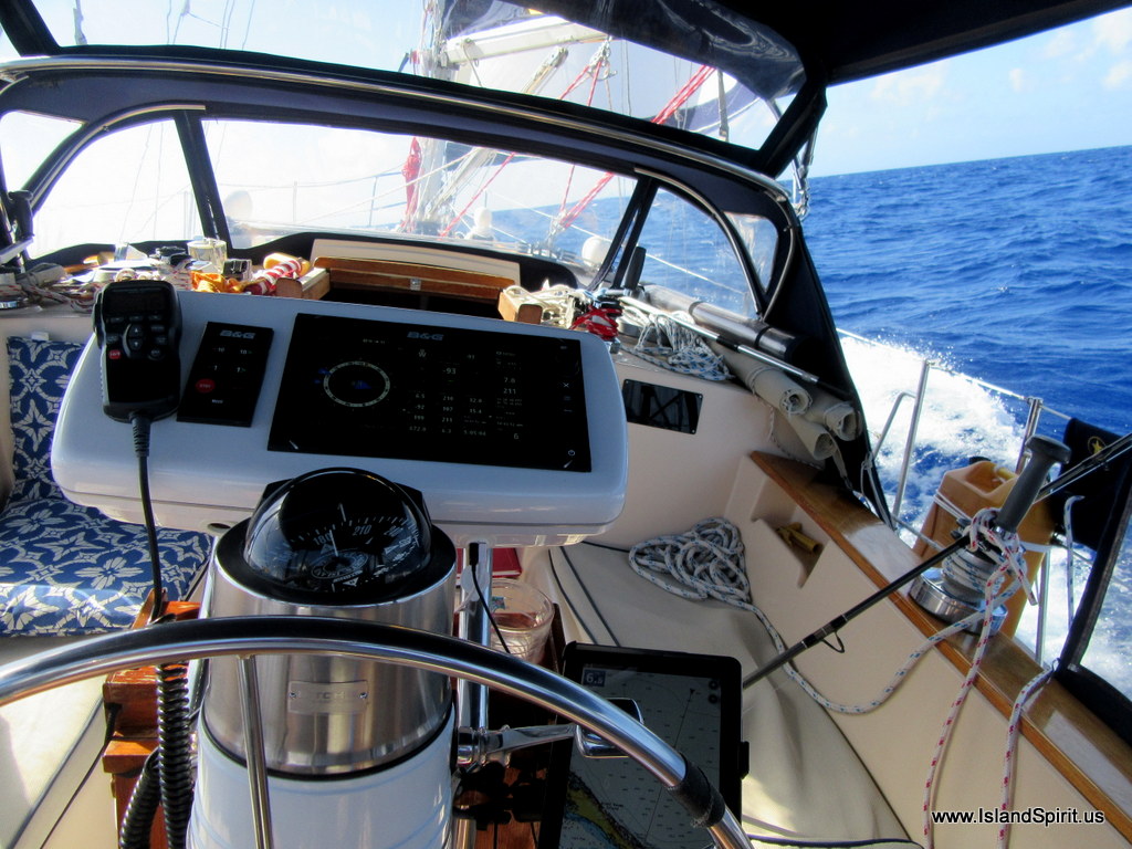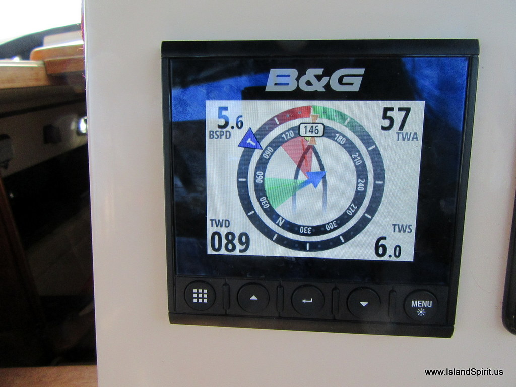 Our passage was in calm seas and light winds of 5-8 knots out of the east, exactly as shown on our Predict Wind app. Our course was 140 degrees placing the wind about 50-60 off the port bow. This was a motor sail with a full main and a staysail with the engine on at 2400-2500 rpms. The boat runs 6 to 6.5 knots round the clock in this situation.