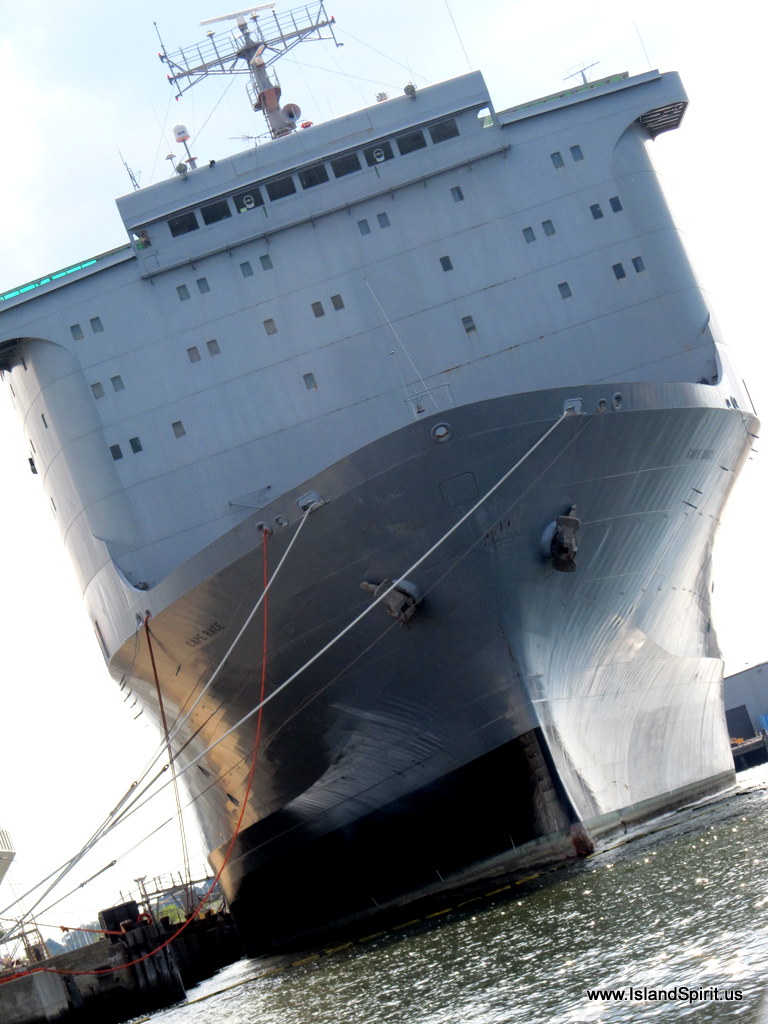 | Interesting Italian Ship passes close by. Note the bow wave well in front… that is the underwater bow bulb projecting well forward of the bow. This ship is doing 15 knots! |