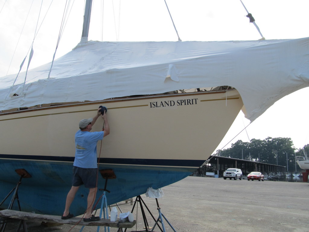 Finally we have begun the spring prep on Island Spirit with a weekend of compounding and waxing the boat. We have done this now for 20 years, and every year I say NEVER AGAIN….but then I forget and I do it anyway. Well, let me tell you, compounding and waxing an Island Packet 35′ sailboat is like waxing a tractor trailer. I am always glad we did not buy a larger boat at this time of the year.