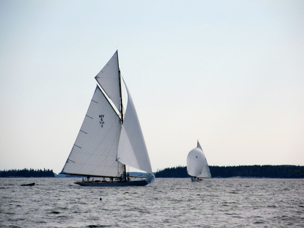 We sailed from Isle au Haut through Merchant Row and up into Eggemoggin Reach just in time to arrive at the finish line of the wooden boat regatta, http://ERregatta.com. This location at Brooklin Maine is the home of WoodenBoat School where you can learn to build your own wooden boat. We have never seen so many magnificent wooden boats and perfectly varnished brightwork and wooden masts and spars in one harbor anywhere.