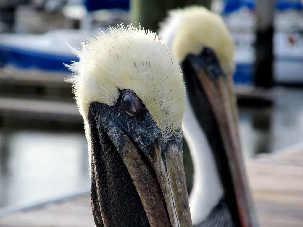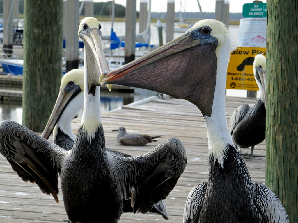 While in Fernandina, Florida, I always get these fantastic pelican photos at the Atlantic Seafood dock. The fisherman toss out the remains from cleaning fish and the birds have been trained to stand near by and wait for the door to open to be fed.