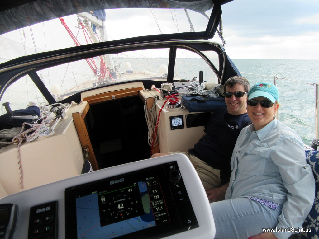 By Tuesday, the front had passed and we headed 15 nm back down the waterway through the city of Miami and back to the beauty of Biscayne Bay. There we set full sail with main, jib and staysail in 15 knots of WEST winds once again. Sailing Biscayne Bay is always a joy because the winds are usually 10-15 and the waves are usually 1 foot or less. Team Island Spirit won our first race of the 2017 racing season as we sailed close hauled next to an S2 who first crossed our bow and then we tacked behind and climbed windward of him and passed him. Fred and Hayden love to trim sails as we used to race together on a J-35 on Long Island Sound for about 7 years. Team Island Spirit was locked on autopilot wind vane steering and we simply sat back and watched her sail up and over this S2 who had a 135 jib against our 110 Mack Sail. We love our New Mack Sails, they look GREAT!