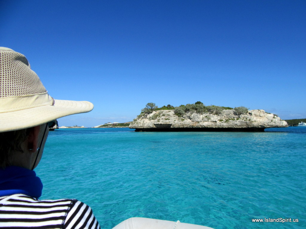 Sailing in the Exumas is always a great experience because the winds are usually from the East and courses are usually North and South. This means a comfortable point of sail called “reaching” to sail from destination to destination. Today, we picked up the anchor at Warderick Wells, Emerald Rock, and within 5 minutes we were under full sail. As we turned the corner and set up our course south to Staniel Cay, we noticed that our new sails seem more powerful. In 18-20 knots of close reaching we needed to drop in the first reef on the main sail. This gave us a chance to test out our new boom arrangement and new single line reefing system under full wind loads. It worked well and once the reef was in and the course was set, Island Spirit sailed even better. I am never disappointed in the way Island Packets will sail. They actually sail upwind very well and they love to beam reach in 15-20 knots.