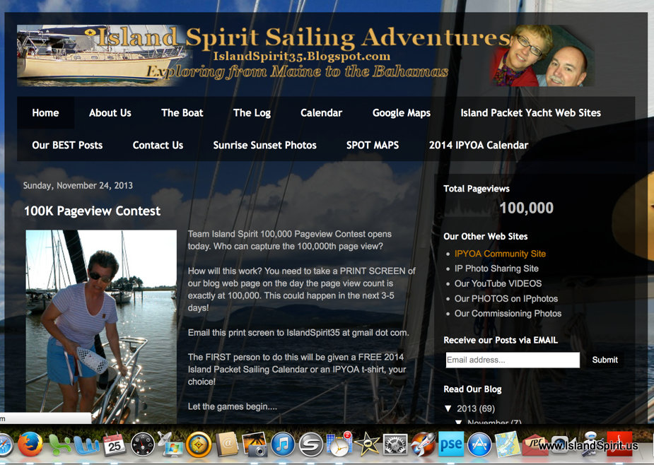 We have a winner of the 100,000th Pageview Contest! Congrats to the proud former owner of IP-350 Eileen, #1 Golden Doodle Master, RV Road Warrior, and very good friend, Greg, who captured the exact moment of the 100,000th pageview of this blog. Thank you to Greg for participating in and winning this world wide contest :-). Your calendar or T-shirt will be in the mail shortly.