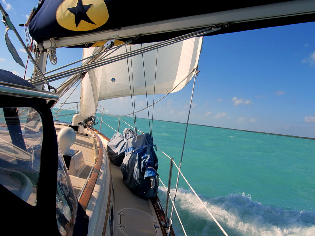 Once at sea in Hawk Channel, we were able to set full sails, with reefed main, full 135% jib and staysail in a wonderful 18-20 knot beam wind! In the world of sailing, this is PARADISE – a dream day. Blue skies, puffy clouds, aquamarine colored water, and sailing at hull speed, it was as good as it gets. We sailed all day, racing to reach the entrance to Channel Five to get back into the Florida Bay side by sunset. Our navigation computer and route told us that we were right on schedule and that we would reach the anchorage by 1730 hrs, and that is exactly what happened. We motorsailed the last 40 minutes into Channel 5 and under the bridge, then turned south where we dropped anchor in Jewfish Hole. The sun was setting as we approached our two buddy boats, Long Gone and Catspaw so we were happy to get the the sails down and the anchor set. I rate today as a 9.5 on the sailing scale, it was a great day….Check out these photos and the color of the water!