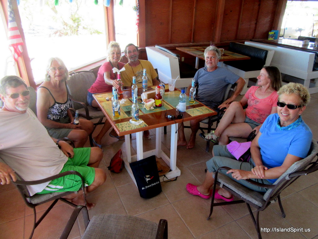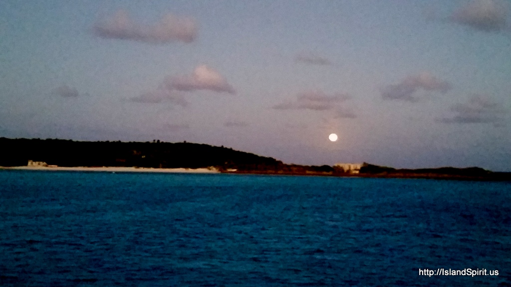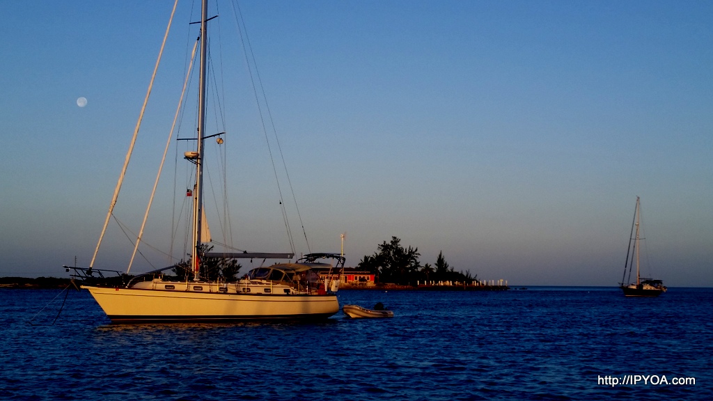 The winds were calm and we were still a few days before the front, so we enjoyed the island scene the next day. We took our dinghies around to the other side and had mid-day refreshments at TY’s Sunset Beach Bar. Wow, what a beautiful place that is. Then in the evening, Dan and Kathy made reservations with Terry Bains, owner of OCEAN CABIN, where we had steak, lobster, fish and conch dinners. While anchored here, we were treated to beautiful sunsets and full moon rises two nights in a row. Fifty-five people live on Little Farmer’s Cay and you can walk the entire island in about 45 minutes. From here, we headed farther south into the less populated Exumas to Rudder Cut Cay.