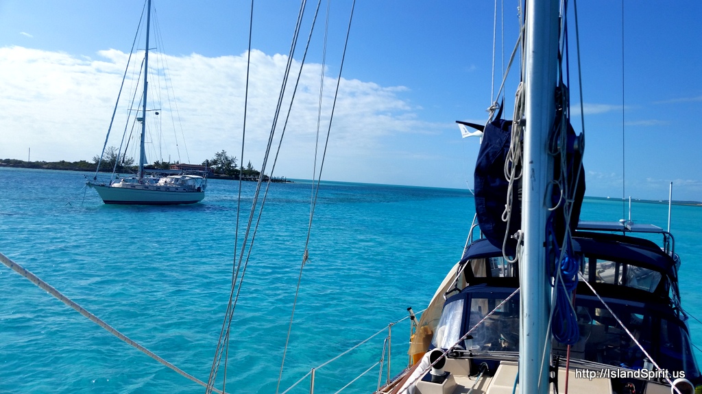 With the lead of Dan and Kathy on IP440 Sea Star, we motor sailed from Black Point to Little Farmer’s Cay into the slot of water between Little Farmer’s and Great Guana Cay. There we dropped the anchor on the sand bar in about 8 feet of water at low tide. The charts show 3 feet of water here, but like so many places we have noticed, the water is actually deeper than the charts show. This turned out to be a great spot with good protection for almost all directions. We enjoyed snacks aboard Carmen and Chuck’s Fontaine Pajot Soul Mates.
