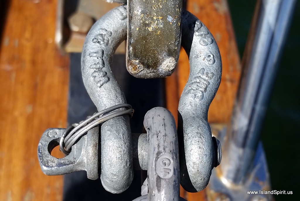 We are offering this old chain at $1/ft to other cruisers, cutting off whatever they want. I already sold 100 feet to one boater. The reason we replaced the chain is that it was bought in 2002 and we are sailing onward to the Caribbean Sea for the next 5 years, so we wanted to go with new chain and a new shackle. Note: 5/16″ G4 HT chain has a 3,900 lb working load and we use the USA made Crosby HT 3/8″ shackle which has a 2t WLL or 2 tons working live load. Many people put the wrong shackle on their HT chain and that becomes the weakest point. We also do not use a swivel because we have a horizontal windlass and the chain does not get turned or twisted very much.