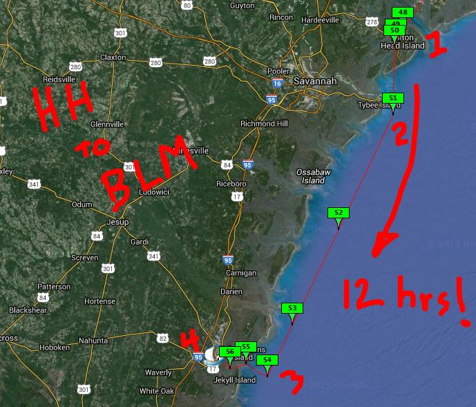 We headed out to sea for an offshore run from Hilton Head to St. Simons Sounds to stop up at Brunswick Landing Marina to see Nina and Bob, one of our buddy boats from last year. We made this run in 12 hours sue to west winds 10-15 and our trusty yanmar motor. Yes we could have sailed at 4 knots all day and all night long, but with a boat that burns 0.75 gallons of fuel an hour this 12 hour motor run costs us 9 gallons of fuel or $18 plus we averaged 7.5 knots for 12 hours and covered 87 nm! We like the speed. When we are on a run, we like to knock it out and we like to keep the boat moving as fast as we can making the time at sea as short as possible. We are not out for a day sail, we are on a trip and we want to run the legs as fast as we can, so we do. When get to destinations like the Bahamas, or Biscayne Bay, or the Keys or the West Coast of Florida, we will sail all we want, but for now, lets move when we can and lets move as fast as we can. That is how we run this.