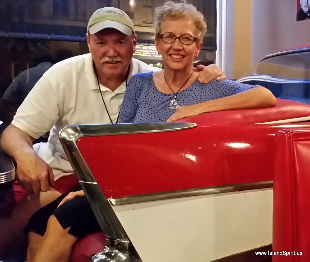 | Hayden and Radeen in a 1957 Chevy pizza parlor seat |