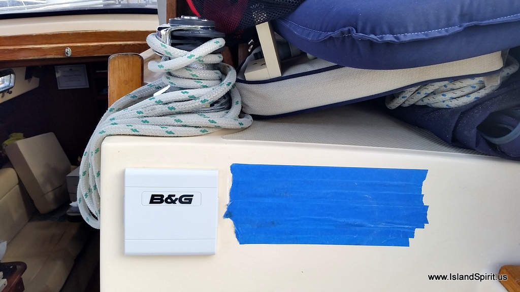 The next task was placing the new Triton2 crew position cockpit display. Back in 1994 when this Island Packet 35 was shipped to Rock Hall MM for the 1993 Annapolis Boat Show, the dealer installed the Wind, Speed and Depth instruments in the front starboard side of the cockpit. This is an easy place to install instruments because the factory designed an open area here with a cabinet and a door giving easy access to this cavity. The problem is that every crew member that sits on starboard will eventually lean back against these three instruments making them impossible to see, plus it is hard on the instrument glazing.