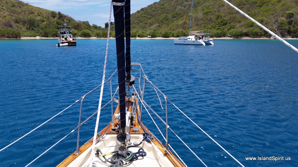 Anchored in Great Harbor at the eastern end of the harbor at Peter Island turned out to be a fantastic location. The anchorage was deep at 40 feet so we laid out 200 feet of chain. What we liked the best was that there was no roll or wrap around swell and for one night our boat did not rock from side to side, but rather sat flat and calm. That may not sound like a big deal but it really is. Being below decks all night with the boat rocking from side to side can be uncomfortable plus plates and glasses slide off the table while dining. When we chartered here, we were usually on catamarans, so the rolling is much less noticeable. We are finding very few anchorages or mooring balls that provide a calm flat anchorage. This one, Great Harbor, was calm. We took advantage of the good conditions to varnish teak and compound and wax the cabin top.