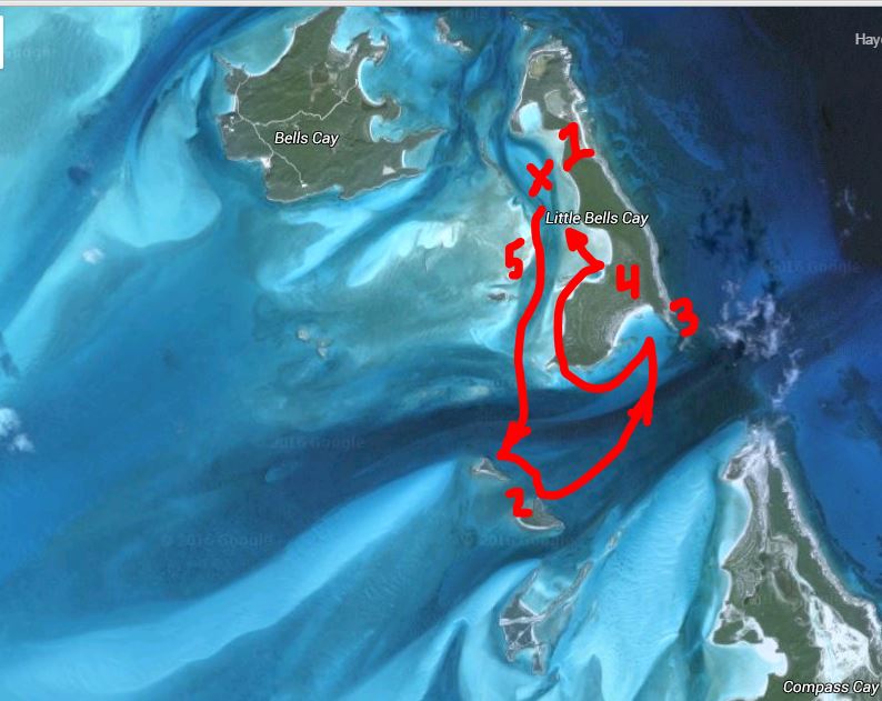 This is the location of Rocky Dundas Caves, at #2 below. We were on a mooring ball at Cambridge Cay (Little Bells Cay) and took the dinghy to Rocky Dundas Caves, we also went to #3 Honeymoon Beach which has staghorn coral, and then the trail at #4 and the small islands at #5. Having a 10′ AB planing dinghy with a 15 hp 2 stroke Yamaha is really a great set up. It allows you to cover so much territory and it is mostly dry and high as it planes over the waves. I have some great videos running the dinghy on these legs.