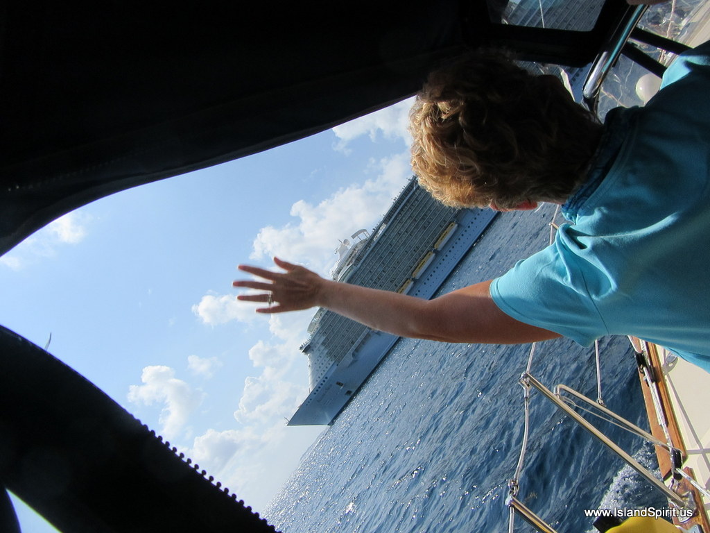 One of the most interesting things that happened was when we left St. Thomas and headed out to the BVIs, we were passed by an incoming cruise ship. We actually had to divert and then take his stern as he was going 12 knots and we were going 6 knots. We could not cross his bow, so we let him cross us. Good idea, right? The ship was also on starboard, so he had the right of way. We were soooooo close, it was very interesting. We had fun waving to all the poeple standing on their balconies and waving back at us. Here are the photos of the crossing….